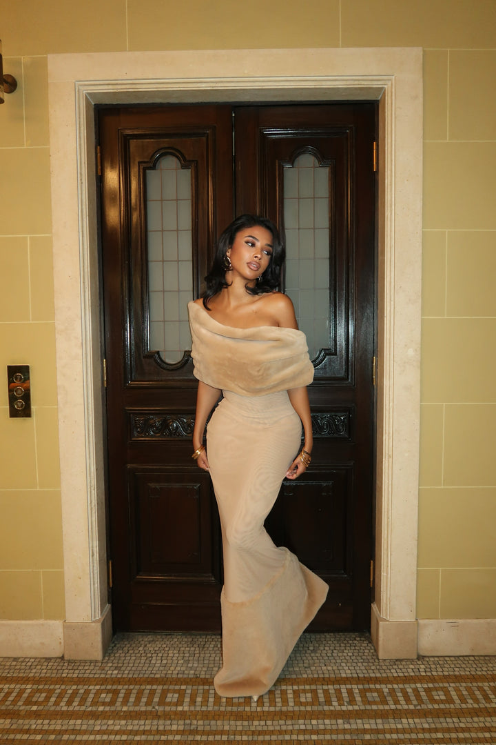 Command attention with effortless elegance in our “Marilyn” dress a statement piece designed for the woman who embodies confidence and grace. Crafted from a plush, double-layered mesh fabric, the cape drapes beautifully off the shoulder. The floor-length design elongates the figure, while the soft neutral tone adds an understated luxury that complements every skin tone.